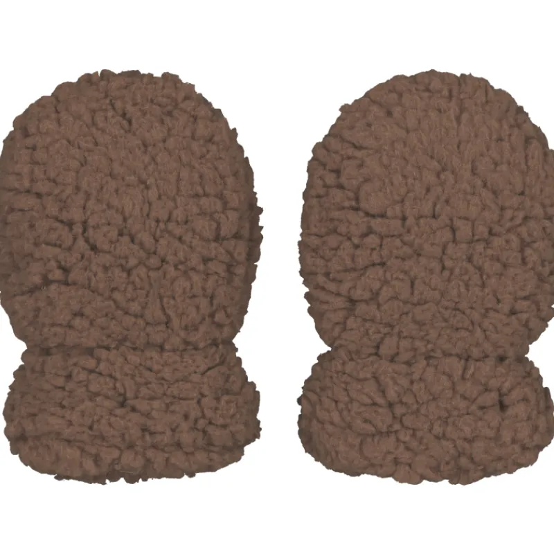 Kaksikerroksisten tumppujen ranteessa on kapea kuminauha, joka pitää käsineet hyvin paikoillaan. Yksivärinen ruskea kuosi.