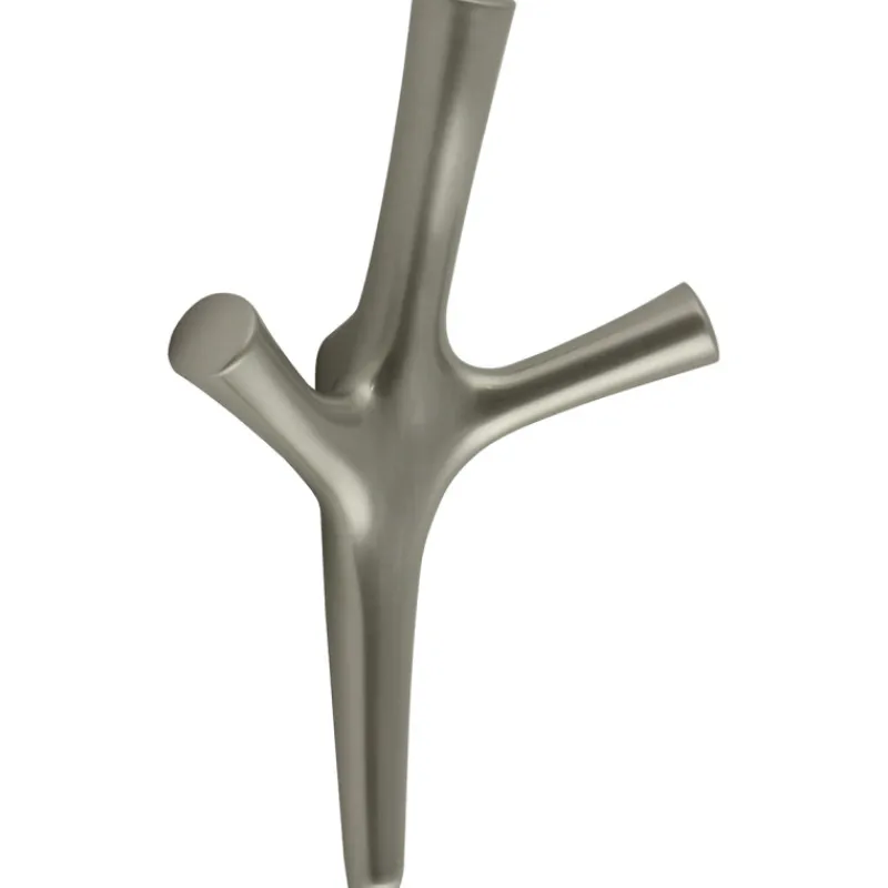 Kolmehaaraista oksaa muistuttava vaatekoukku piilokiinnityksellä. Materiaali samakkia, joka on viimeistelty harjatun nikkelin sävyyn. Mitat: 110 x 58 x 160 mm.