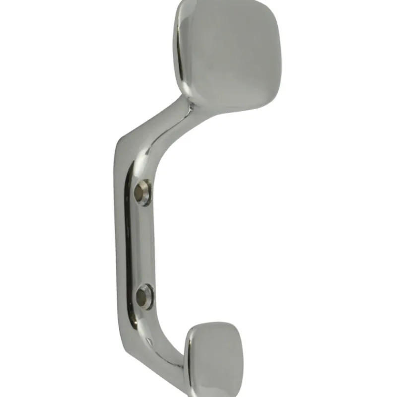 Modernisti muotoiltu kaksiosainen vaatekoukku. Materiaali samakkia, joka on viimeistelty kromin sävyyn. Mitat (L x S x K): 45 x 40 x 110 mm.
