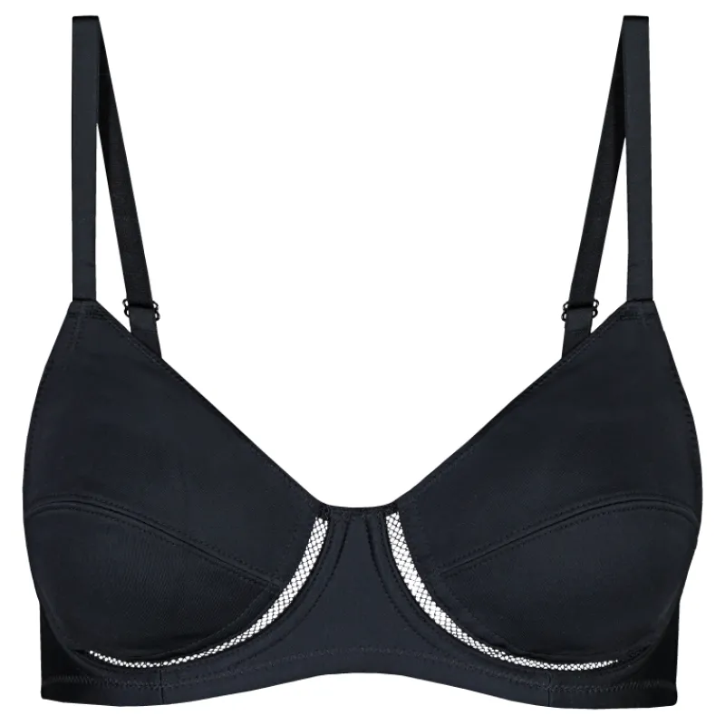 Sileää kuosia somistaa kuppien alareunaa myötäilevä verkkopitsikaitale, väri musta.