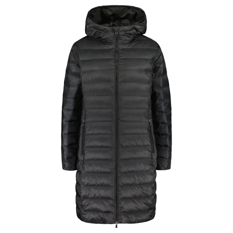 Kevyt naisten untuvatakki vaakatikkauksilla ja noin polvipituisella mallilla. Paljon kokoja, isoin koko 3XL (56/58).