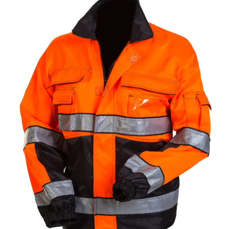Oranssi/musta vuoriton varotakki. Materiaali 80% polyesteriä ja 20% puuvillaa. Pesu 40 asteessa. EN 20471 Lk.2.