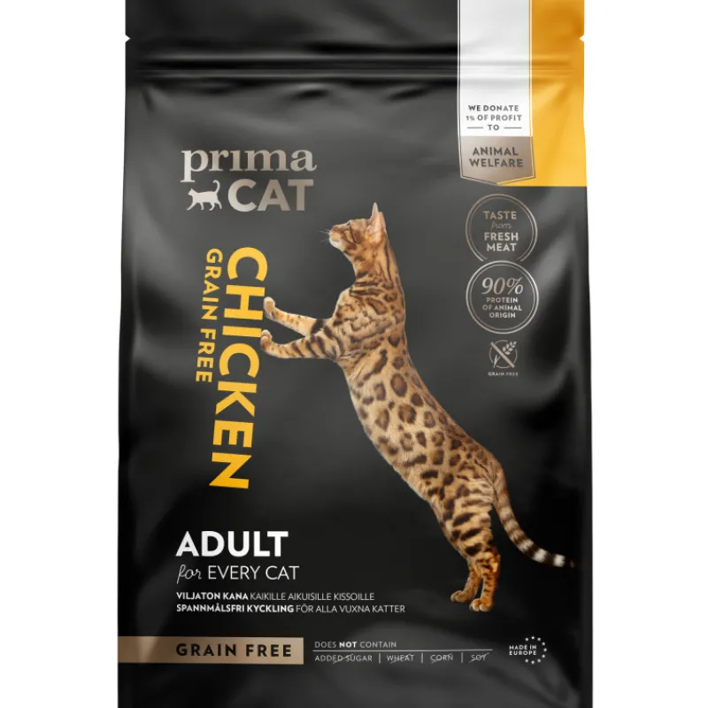 PrimaCat Viljaton kana aikuisille kissoille -kissanruoka soveltuu kaikille kotikissoille mutta erityisesti nuorille ja aktiivisille kissoille, joiden energiantarve on korkeampi. Ruoan pääraaka-aineena toimii tuore kana, jota nirsonkin kissan on vaikea vastustaa.