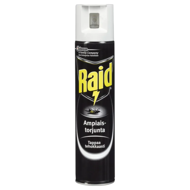 Raid Ampiaistorjunta torjuu ampiaiset ja muut lentävät hyönteiset tehokkaasti ja varmasti. Tehoaine pyretriini tainnuttaa ampiaiset nopeasti kosketuksesta, mutta jää vaikuttamaan muutamaksi vuorokaudeksi käsitellylle pinnalle. Tuote on tarkoitettu käytettäväksi sisätiloissa. Aerosolia ei tarvitse kohdistaa hyönteiseen, vaan ilmassa leijuva sumu riittää torjumaan ne. Pakkauskoko 300 ml.