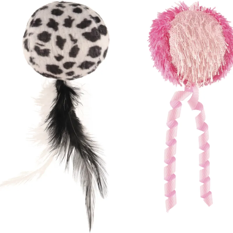 Kaksi pehmeää kissanpalloa, joissa innostavat hännät. Pallojen sisällä kissanminttua. Halkaisija noin 5 cm.