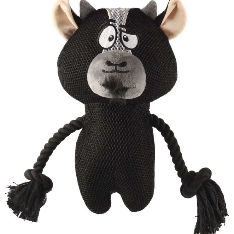 Musta härkälelu on valmiina haastamaan isommankin koiran! Mesh-kankaisella pehmohärällä on köysikädet ja hauskana yksityiskohtana pehmeä parta ja häntätupsu. Sisällä vinku.