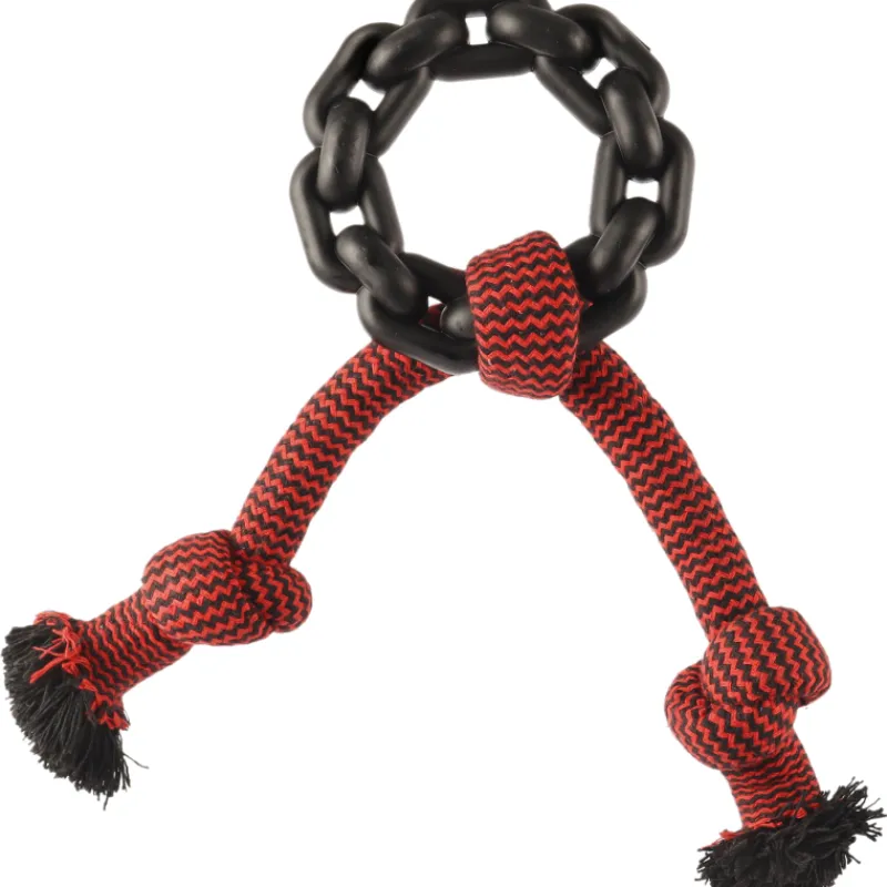 Kuminen kettinki ja pehmeämpi köysilelu yhdessä tarjoavat hauskoja leikkihetkiä isolle sekä keskikokoiselle koiralle. Kettinkilenkki toimii hyvänä kädensijana yhteisissä vetoleikeissä ja köydestä koira saa hyvän puruotteen.