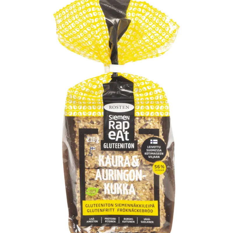 Rostenin herkullisten siemennäkkärien gluteeniton vaihtoehto! Kaura & Auringonkukka on proteiinipitoinen ja hyvä kuiduin lähde. Tuote sisältää siemeniä runsaat 56 %.
