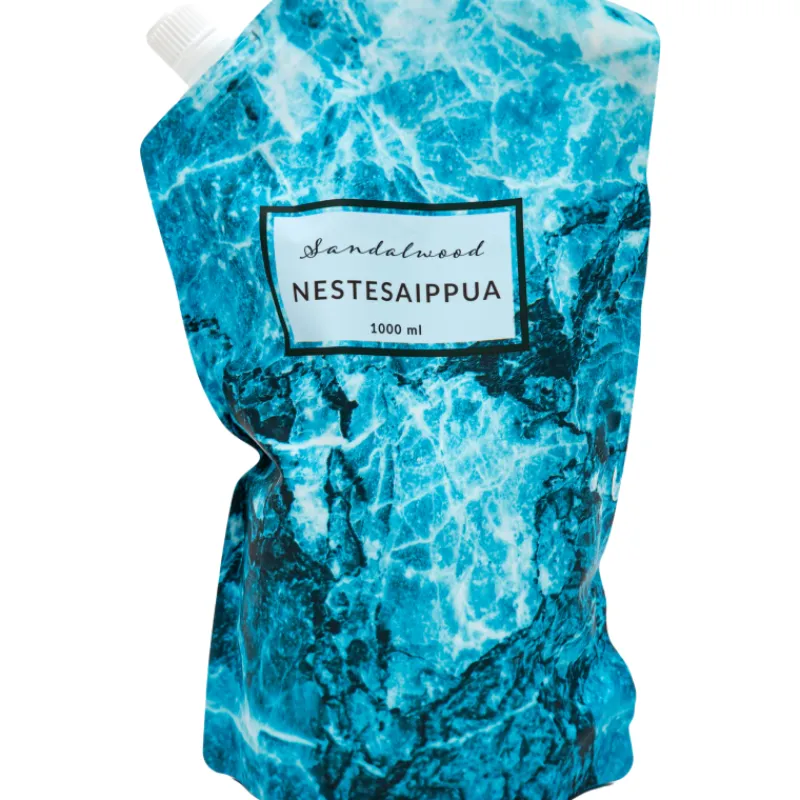 Sandalwood nestesaippuan täyttöpussi sisältää miellyttävää santelipuun tuoksuista saippuaa. Korkillisella täyttöpussilla täytät helposti tyhjät kodin saippuapumput.