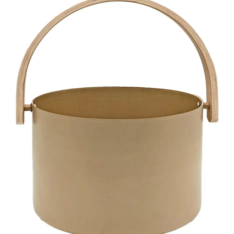 Moderni Saunia kultahiekka -saunasanko taivutetulla puukahvalla. Valmistettu alumiinista. Tilavuus 6 l.