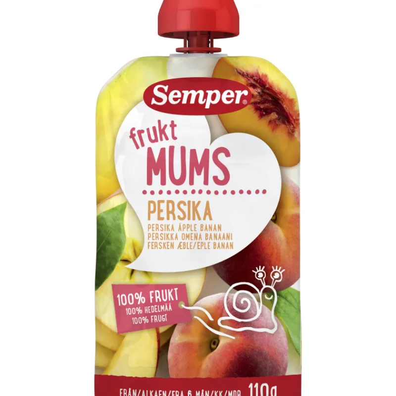 Persikkaa, omenaa ja banaania sisältävä Semper Fruktmums Persikka -hedelmäsose on koko perheelle sopiva herkullinen ja terveellinen välipala tai jälkiruoka. 100 % hedelmäinen sose on pakattu kätevään annospussiin, josta lapsi voi itse pitää kiinni ja joka kulkee mukavasti mukana myös kodin ulkopuolella.
