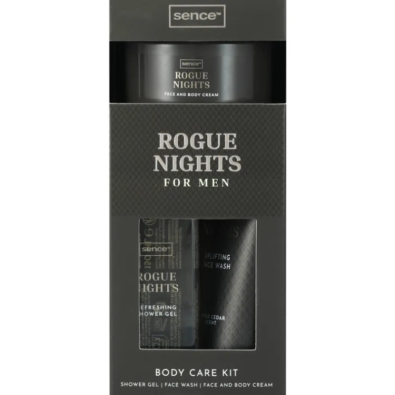 Pakkaus sisältää: Luxe Rogue Nights -suihkugeelin (150 ml), Luxe Rogue Nights -kasvojen pesuaineen (75 ml) ja Luxe Rogue Night -kosteutusvoiteen (125 ml).