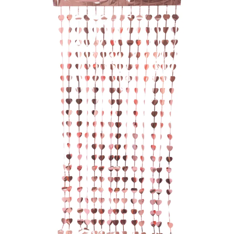 Kiiltävistä vaaleanpunaisista sydämistä koostuva folioverho on kaunis koriste erilaisiin juhliin. Verhon leveys on noin 1 metri ja korkeus noin 2 metriä. Yläreunassa on tarrapinta kiinnittämistä varten.