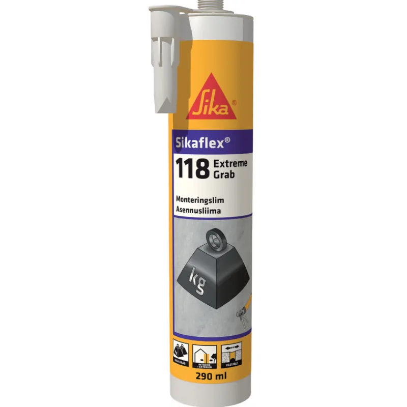 SikaFlex-118 Extreme Grab on 1-komponenttinen asennusliima, jolla on hyvä alkutartunta yleisimpiin rakennusmateriaaleihin. Soveltuu raskaiden esineiden kiinnittäminen ilman väliaikaista tukea. Hyvä työstettävyys. Sisä- ja ulkokäyttöön. Väri valkoinen.