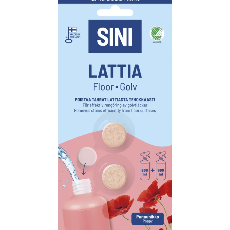 Sini Lattia puhdistusainetabletti -täyttöpakkaus on kätevä tapa vähentää siivoamisesta aiheutuvaa muoviroskaa. Veteen liuotettava puhdistusainetabletti puhdistaa tahrat kodin lattioilta tehokkaasti. Se sopii kaikille lattiapinnoille nihkeäpesuun. Ihastuttava punaunikon tuoksu. pH-arvo n.8.