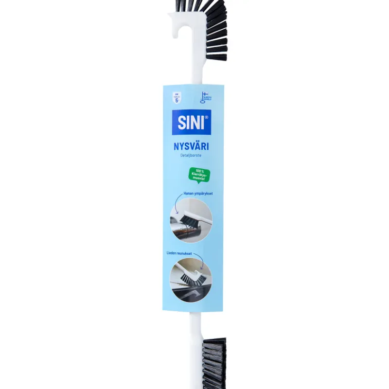 SINI-nysvärillä pääset puhdistamaan hankalat kolot ja rakoset helposti. Täsmäharja puhdistaa hyvin esimerkiksi hanojen ympärykset ja pesualtaitten pienet koloset ja tiski- ja pyykinpesukoneitten tiivisteet. Pienen ja kapean nysvärin harjas on napakka ja se kestää kovankin jynssäämisen. Väri valkoinen.