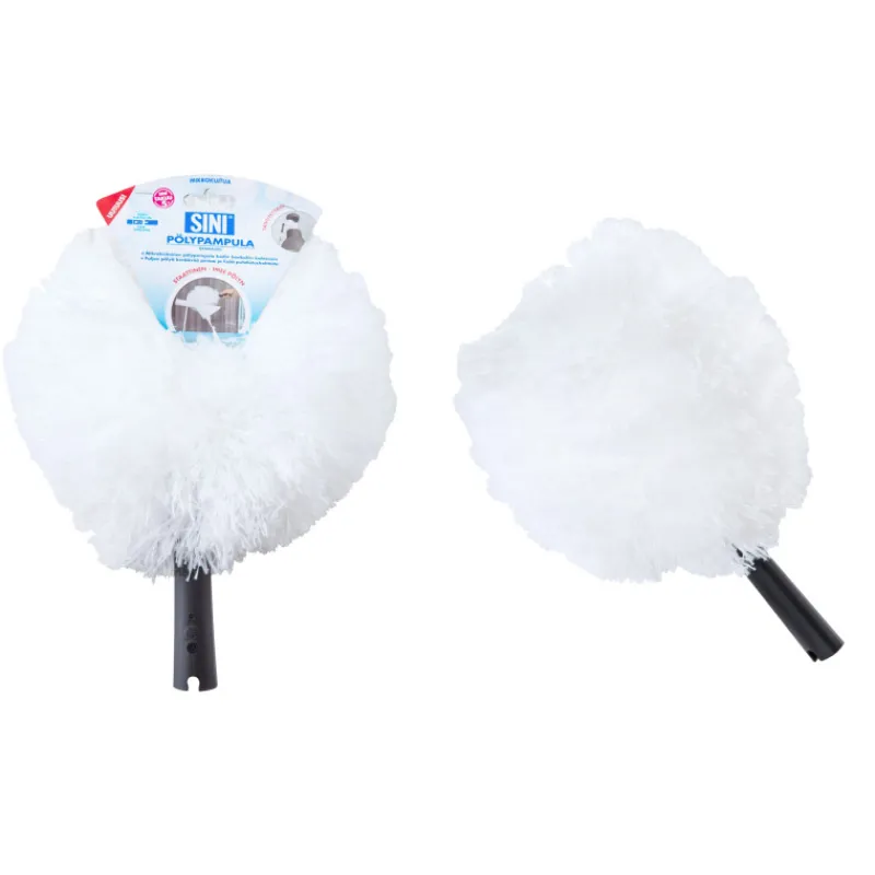 SINI Pölypampulalla siivoat tehokkaasti pölyt ja hämähäkin seitit nurkista, katosta sekä hankalistakin paikoista kuten puu- ja hirsipinnoilta. Mikrokuituinen materiaali on staattinen eli sitoo erinomaisesti pölyä itseensä ja lenkkimäisen muodon ansiosta käyttöominaisuuksia on monia. Muhkeassa pölyhuiskassa on runsaasti pölyä keräävää pintaa ja se voidaan kiinnittää SINI-välinevarteen, jolloin yltää myös korkeampiin paikkoihin sekä matalien huonekalujen alle. Kädensijan materiaali on polypropeenia, koko: leveys: 25 cm, korkeus: 34 cm. Takuu 5 vuotta.