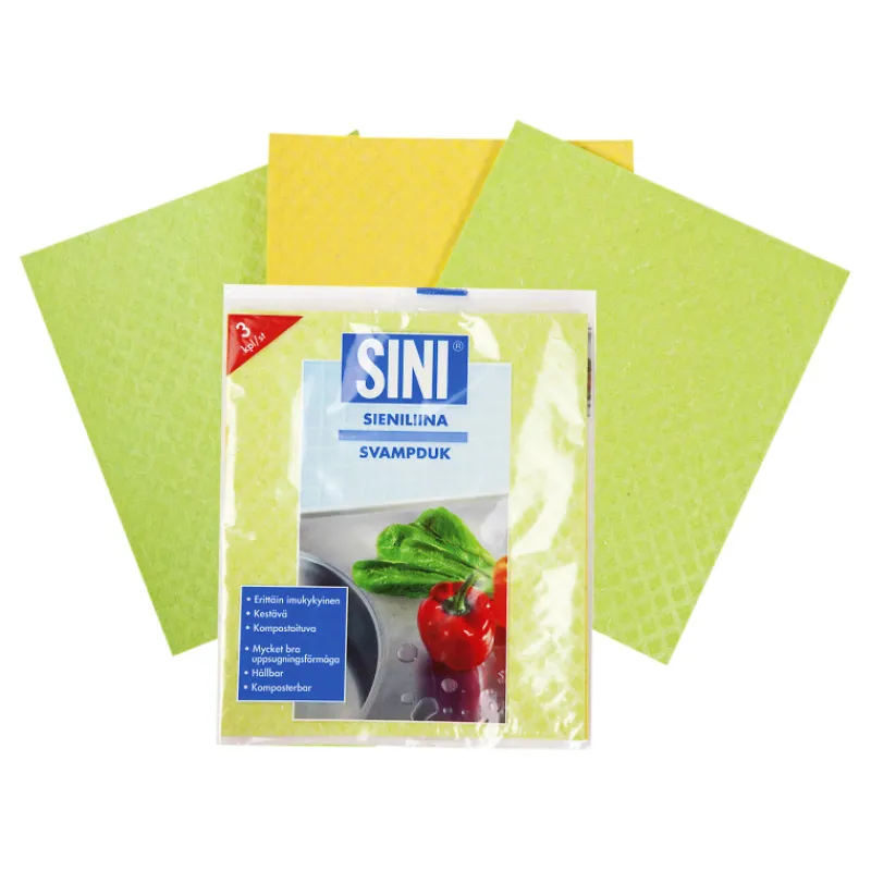 Erittäin imukykyinen kuiva SINI Sieniliina. Sieniliina imee jopa 15 kertaa oman painonsa vettä. Sieniliina puhdistaa pinnat keittiössä, kylpyhuoneessa ja wc:ssä jälkiä jättämättä eikä nukkaa. Kestävä ja kompostoituva. Sieniliinan koko on 18 x 20 cm. Pakkauksessa on 3 kpl.