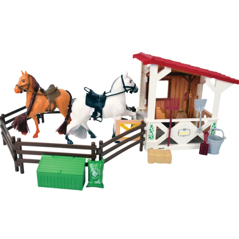 Pakkaus sisältää tallin, kaksi hevosta ja tarvikkeet. Saatavilla kaksi erilaista leikkisettiä.