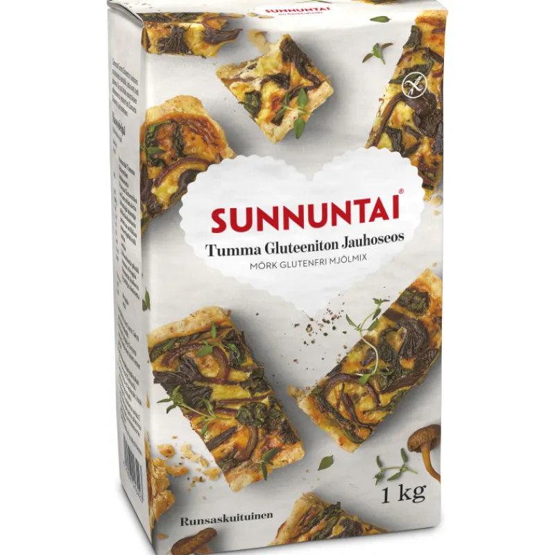 Sunnuntai Tumma gluteeniton jauhoseos on runsaskuituinen leivontajauhoseos, joka sopii gluteenittomaan ruokavalioon – ja miksei muillekin. Jauhoseoksesta voi valmistaa leipää sellaisenaan tai yhdistää esimerkiksi Sunnuntai Gluteenittomaan jauhoseokseen. Tumma gluteeniton jauhoseos sisältää mm. gluteenitonta vehnätärkkelystä, riisijauhoa, sokerijuurikkaan kuitua ja porkkanahiutaleita, ja siihen on lisätty vitamiineja ja rautaa.