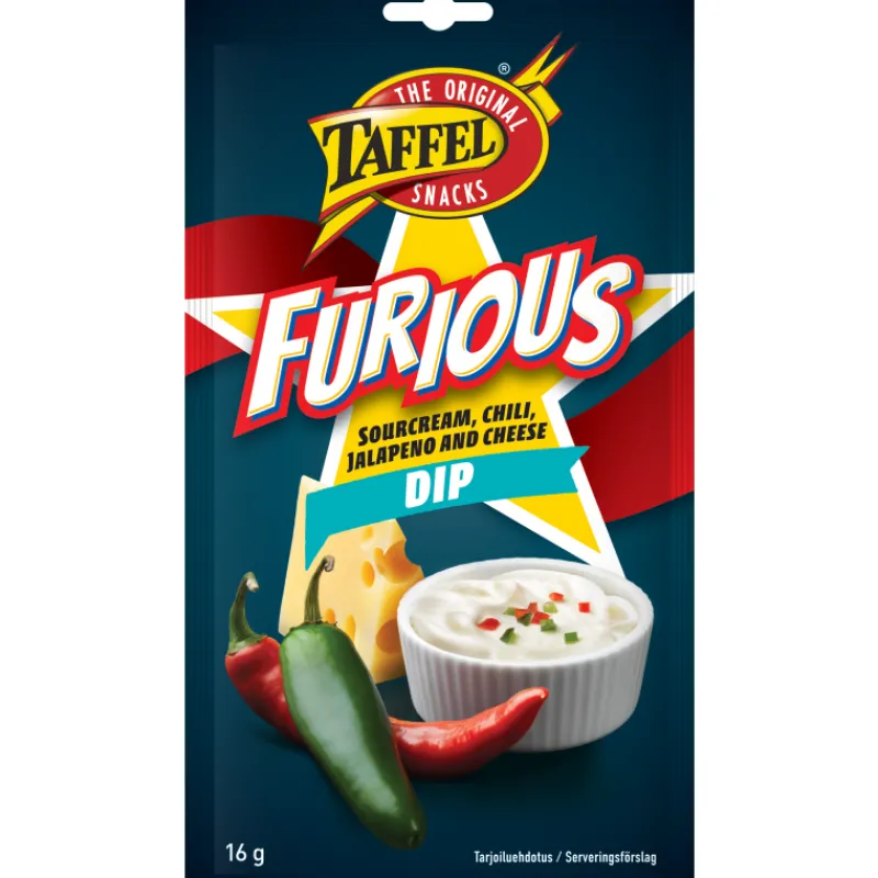 Taffel Furious -dippimauste on poikkeuksellinen yhdistelmä jalapenoa, juustoa, sourcreamia ja sopivan tulista chiliä. Dippimauste on kehitetty Taffel-fanien toimesta suuressa makuhaasteessa.