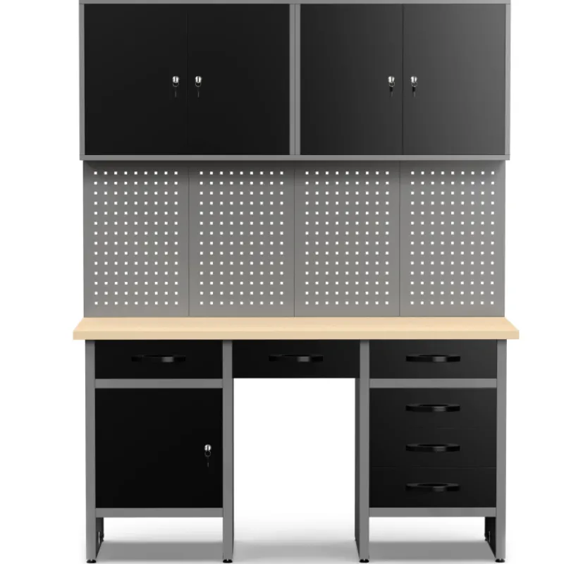 Välitila on täynnä reikälevyseinää, joihin voi halutessaan asentaa koukkuja, telineitä, tasoja yms. työkaluja ja tarvikkeita varten. Kaikki viisi kaappia ovat lukittavia. Toimituksen mukana tulee kaksi avainta.