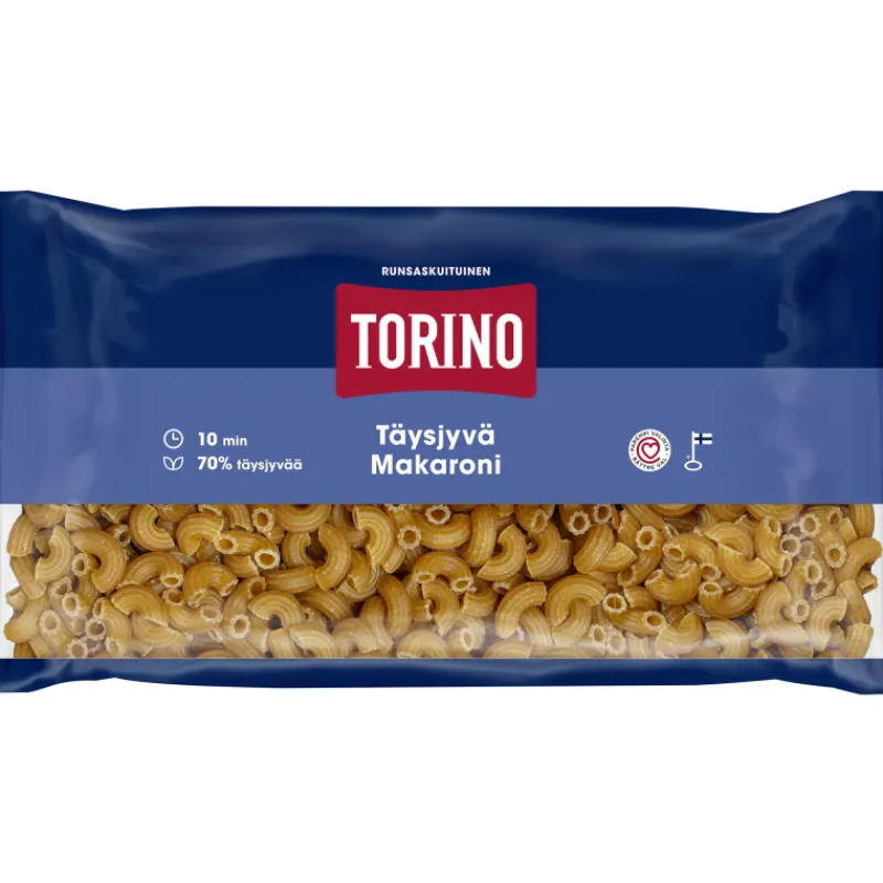 Runsaskuituinen Torino Täysjyvämakaroni on soveltuu monipuolisesti erilaisiin makaroniruokiin, erityisesti laatikko- ja pataruokiin. Täysjyvävilja sisältää kaikki jyvän ravintorikkaat osat ja se antaa makaronille täyteläisen viljaisen maun. Valmistettu hiilineutraalilla energialla Raisiossa.