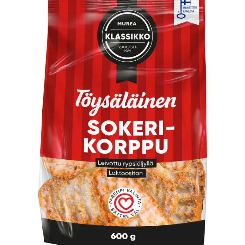Töysäläisen murea sokerikorppu on valmistettu perinteisellä ammattitaidolla. Rypsiöljyllä leivottu sokerikorppu on saanut Parempi valinta -sydänmerkin. Laktoositon, munaton. Valmistettu Suomessa. Pakkauskoko 600 g.