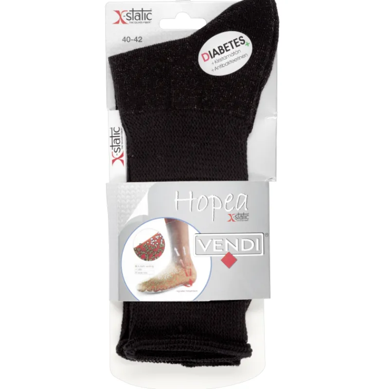 Vendi-hopeakuitusukat sisältävät X-Static-kuitua, Ökotex-sertifioitua puuvillaa sekä muita korkealaatuisia kuituja, jotka takaavat laadukkaat ja mukavat sukat terveystietoisille jaloille.