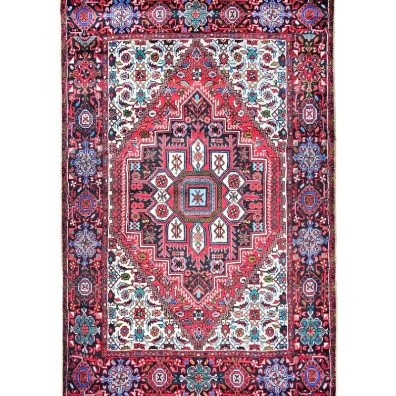 Suorakaiteen muotoisen maton reunoilla on siisti kanttaus. Samettisen pehmeä, chenillepintainen itämainen kuvio-kuosi, väri punainen.