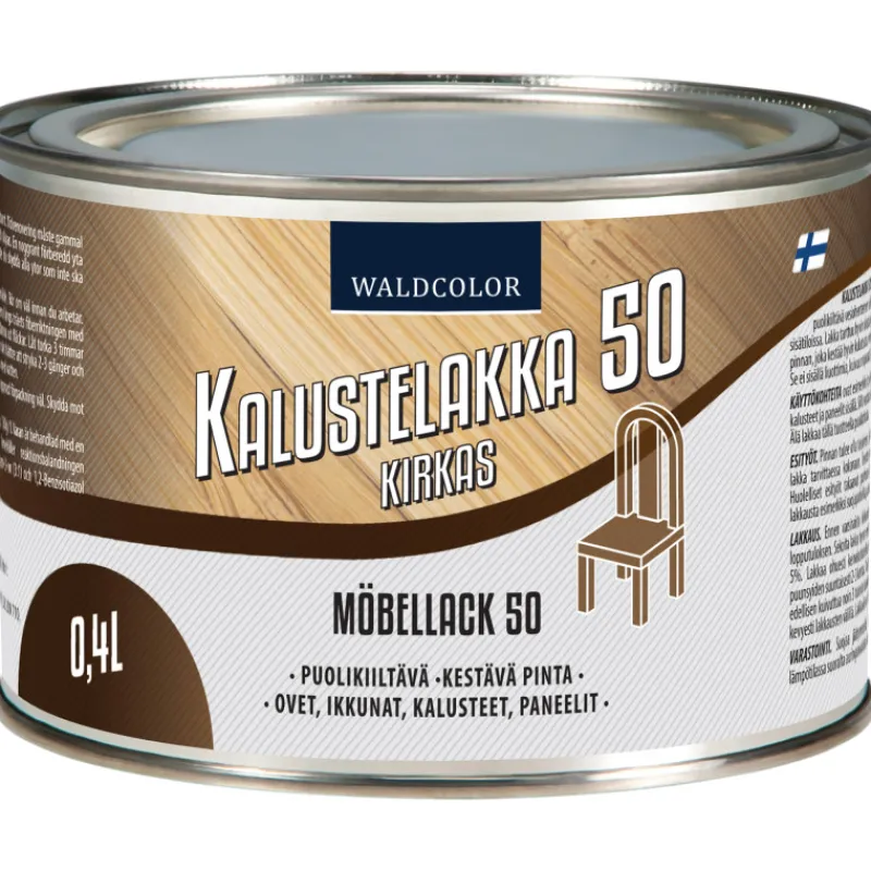 Waldcolor Kalustelakka 50 on kirkas, puolikiiltävä vesiohenteinen akrylaattilakka puupinnoille sisätiloissa. Lakka tarttuu hyvin alustaan ja tasoittuu hyvin. Se muodostaa kovan pinnan, joka kestää hyvin kulutusta, vettä, alkoholia ja pesua useimmilla puhdistusaineilla. Ei sisällä liuottimia, kuivuu nopeasti, tuoksu on mieto ja sitä on helppo käyttää. Käyttökohteita ovat esimerkiksi puiset uudet ja ennen lakatut ovet, ikkunanpuitteet, kalusteet ja paneelit sisällä. Purkki 0,4 l.