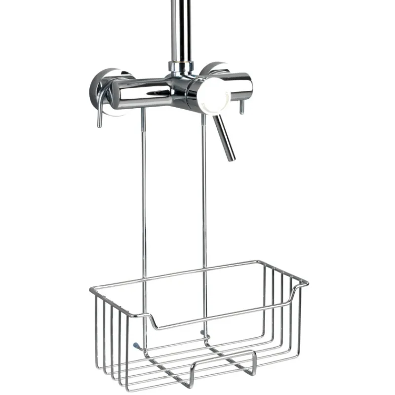 Suihkuhyllykkö, joka ripustetaan sekoittajaan. Valmistettu ruostumattomasta teräksestä, krominvärinen. Helppo asentaa, ei vaadi porausta. Soveltuu esim. kylpyhuoneeseen tai saunan pesutilaan. Mitat 25 x 14 x 36 cm.